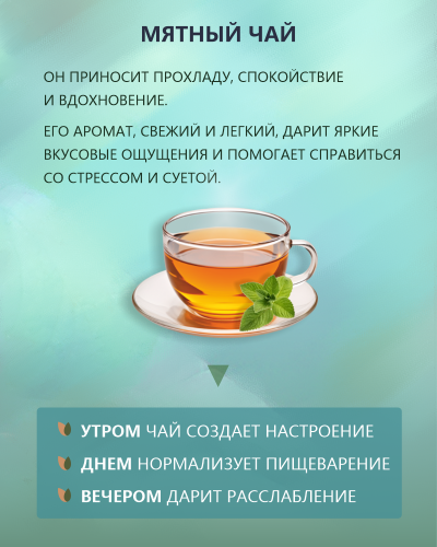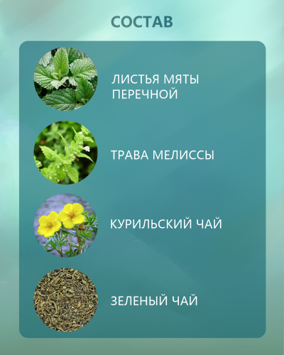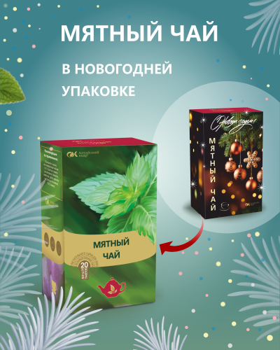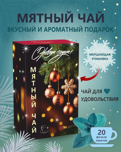 Погрузитесь в атмосферу зимних праздников с этим чудесным подарком к Новому году. Мятный чай приносит прохладу, спокойствие и вдохновение. Наполняет тело и душу долгожданным расслаблением и комфортом. Его аромат, свежий и легкий, дарит яркие вкусовые ощущения и помогает справиться со стрессом и суетой. Прекрасный купаж мяты, мелиссы, курильского и зеленого чая поможет вам окунуться в мир гармонии и блаженства самой природы.
