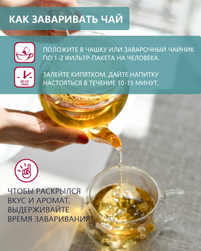 Положите в чашку или заварочный чайник по 1-2 фильтр-пакета на человека. Залейте кипятком, дайте напитку настояться в течение 10-15 минут.